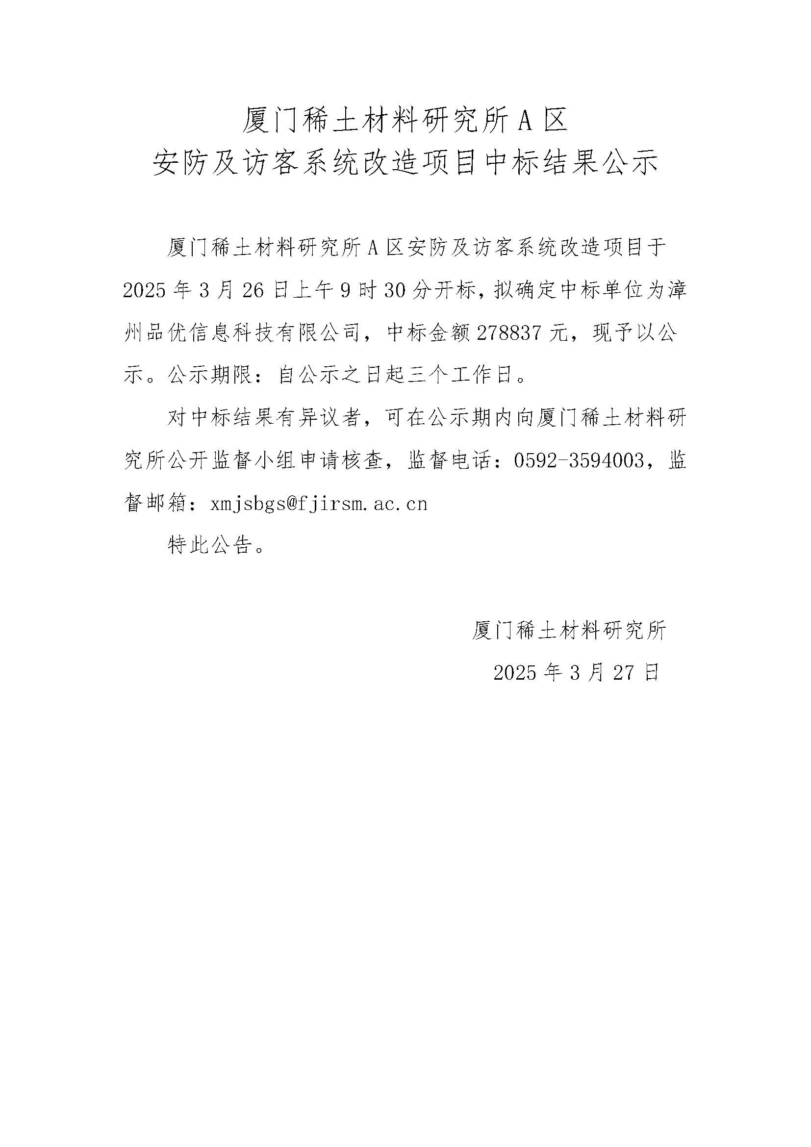 厦门稀土材料研究所A区安防及访客系统改造项目中标结果公示