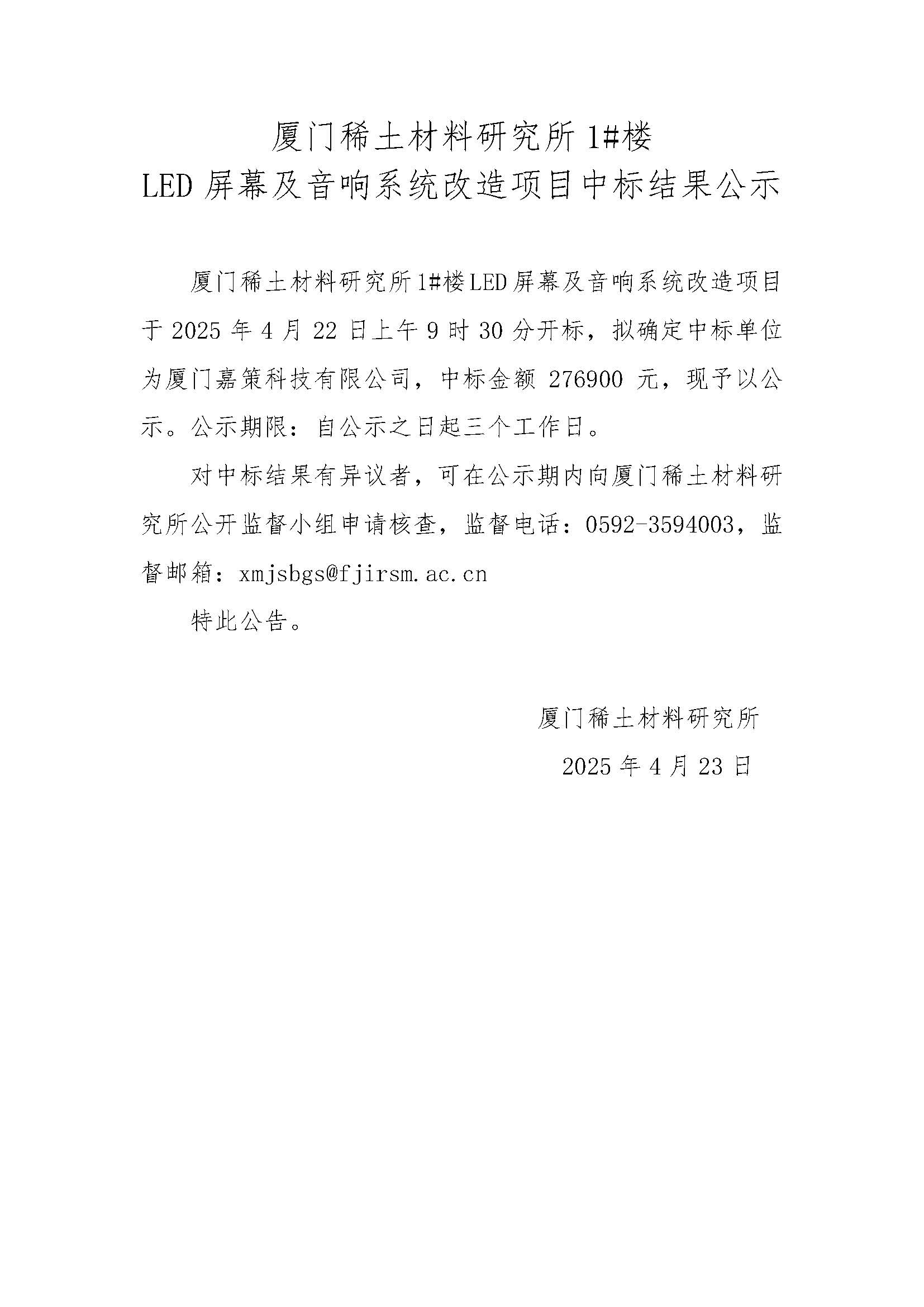 厦门稀土材料研究所1#楼LED屏幕及音响系统改造项目中标结果公示