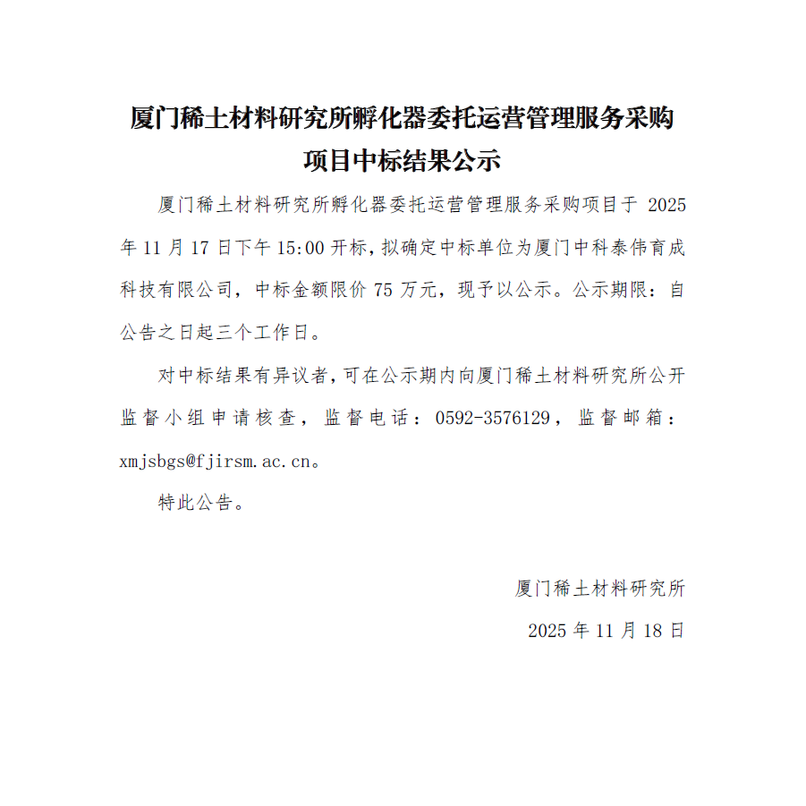 厦门稀土材料研究所孵化器委托运营管理服务采购项目中标结果公示